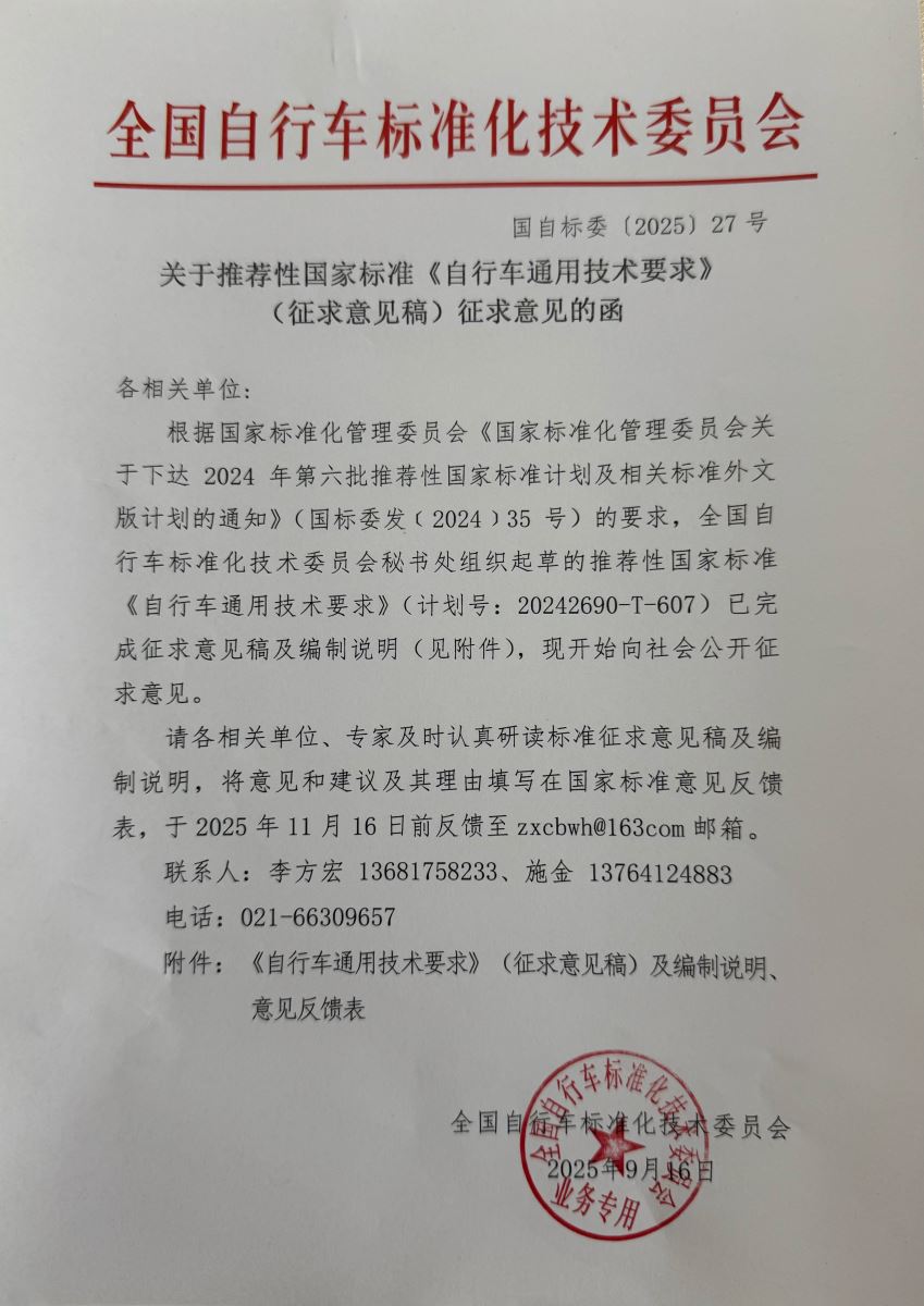 关于推荐性国家标准《自行车通用技术要求》(征求意见稿)征求意见的函 来源:中自协 作者: 发布时间:2025-09-16 14:08 附件:1.《自行车通用技术要求》(征求意见稿) 2.《自行车通用技术要求》(征求意见稿)编制说明 3.《自行车通用技术要求》(征求意见稿)意见反馈表