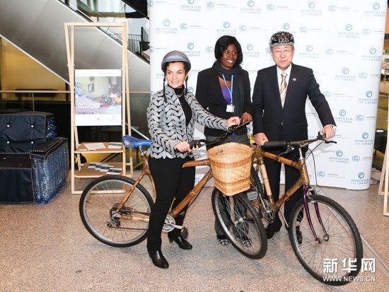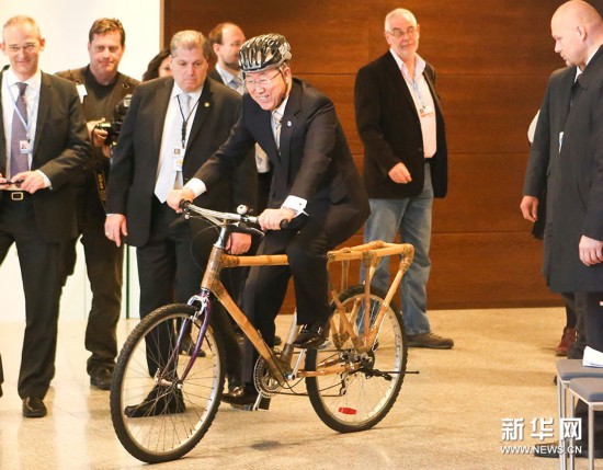 当地时间2013年11月20日,波兰华沙,联合国秘书长潘基文在参加气候大会期间,试骑一辆加纳女青年制作的竹制自行车。
