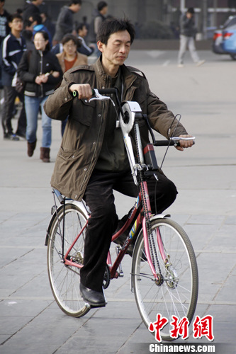 山西“鲁班”自制“太极自行车”锻炼身体 来源:中国新闻网 作者:韦亮 摄 发布时间:2012-03-23 15:23 3月18日,在山西太原街头,民间“鲁班”于建明骑着自制的“太极自行车”锻炼身体。于建明发明的这辆两驱自行车,手摇驱动前轮,脚蹬驱动后轮,骑行速度不宜过快,而且需要手脚并用,颇似中国传统太极拳,于是于建明给自己的这个发明命名叫“太极自行车”。 摘编:admin888; 摘编日期:2012年3月18日
