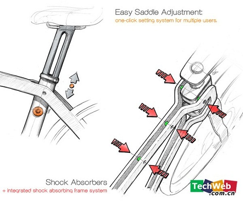 据了解,自行车有一个独创的鞍座,只需按一下按钮就可以调整车座的高度。前轮有一个精心设计的发电机,除了发电之外,还可以把车速、距离等信息直接发到固定在车把的智能手机上。