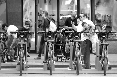 5月27日,市民在纽约市曼哈顿区一处自行车服务站点查看可租用的自行车。当天,纽约市正式启动“自行车共享计划”,市政府在市区设立330个站点,提供6000辆自行车,供市民和游客使用。这是全美国规模最大的一项自行车共享计划。