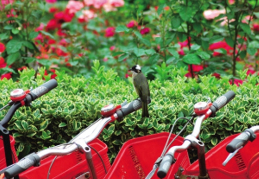 公共自行车车把上停着小鸟