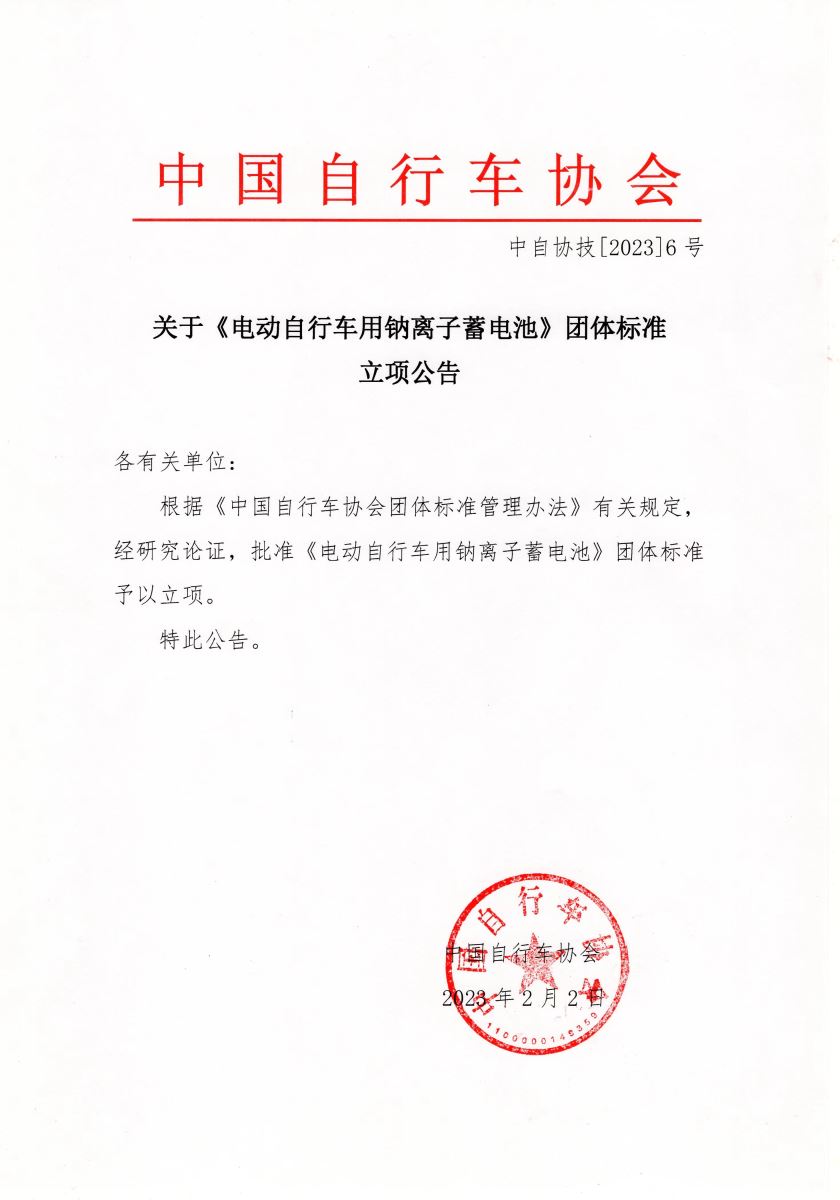 关于《电动自行车用钠离子蓄电池》团体标准立项 公告