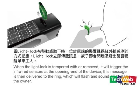 这款Light-lock无线感应灯锁上有个无线感应指环,将它戴在手指上,然后,将之卡在车条上,你就可以离开了。一旦有人移动这车,或者取下了Light-lock,指环就会以声光的形式提醒你注意。