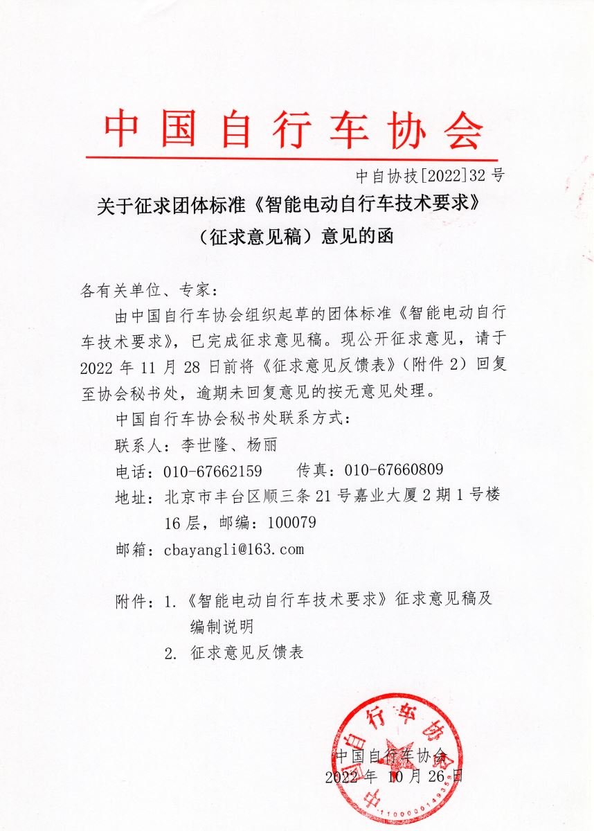 关于征求团体标准《智能电动自行车技术要求》(征求意见稿)意见的函 来源:中自协 作者:技术标准部 发布时间:2022-10-26 11:13 附件:1.《智能电动自行车技术要求》征求意见稿及编制说明 2. 征求意见反馈表