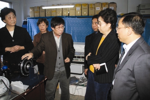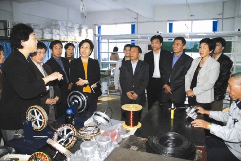 图:天津市政府王志铭副秘书长在市科委陈养发副主任、红桥区政府卢志勇副区长及科委马静茹主任和天津市自行车行业协会理事长龚孝燕等有关领导的陪同下,考察被天津市市长黄兴国誉为“电动自行车领域的动力革命”的天津瑞起科技公司自主研发"小型三相高性能方波永磁直流低速无刷电机"与最新型“智能化中置无刷电机驱动控制系统”两项发明专利项目。