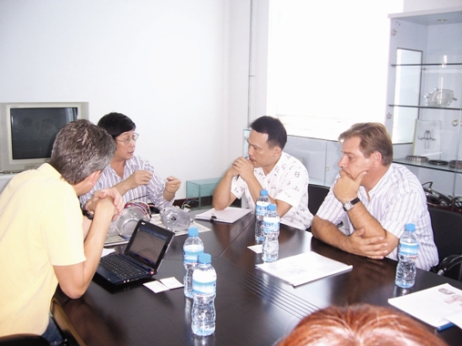 图:天津瑞起公司李平董事长向天津市、区政府有关领导和天津市自行车行业协会理事长汇报自主发明的"小型三相高性能方波永磁直流低速无刷电机"项目的成果转化工作。