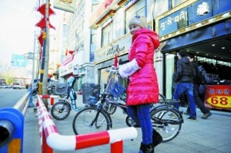 11月14日,记者路过拉萨宇拓路时,发现在机动车道旁边一个个红白相间的栏杆,在栏杆内,整齐地停放着自行车、电动车,还有很多前来购物的市民将自己的自行车、电动车停放在这里。