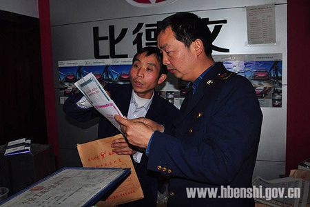 3月19日,恩施市工商局工作人员正在州城某电动车销售门店检查业主经营许可证、产品出厂合格证。