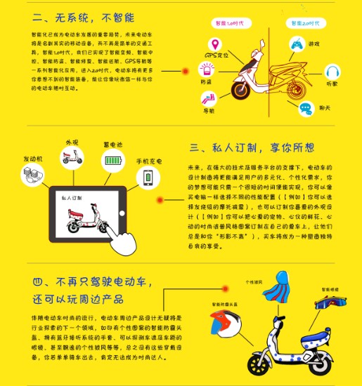 伴随电动车时尚的流行,电动车周边产品设计无疑将是行业探索的下一个领域,如印有个性图案的智能防霾头盔、 拥有蓝牙接听系统的手套、可以探测车速及车距的眼镜、甚至飘逸的个性披风等等,总之没有这些穿戴设备,你若单单骑车出去,肯定无法成为时尚达人。