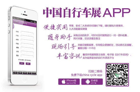 苹果系统和安卓系统的手机用户,可下载安装CHINA CYCLE (中国自行车展)APP软件,在“个人中心——预登记”栏目中填写个人信息完成展前预报名。凡是下载CHINA CYCLE APP软件的使用者,均可在4月13日-16日(展会期间),前往上海新国际博览中心内广场新闻中心,领取由佛山市顺德区跨速头盔有限公司(MOON)提供的骑行头巾一条,数量有限,送完为止。