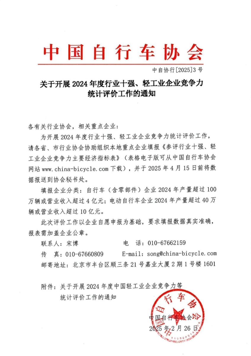 关于开展2024年度行业十强、轻工业企业竞争力统计评价工作的通知 来源:中自协 作者: 发布时间:2025-02-27 14:29 附件: 1、关于开展2024年度中国轻工业企业竞争力等统计评价工作的通知 2、2024年度行业十强及百强企业报名表
