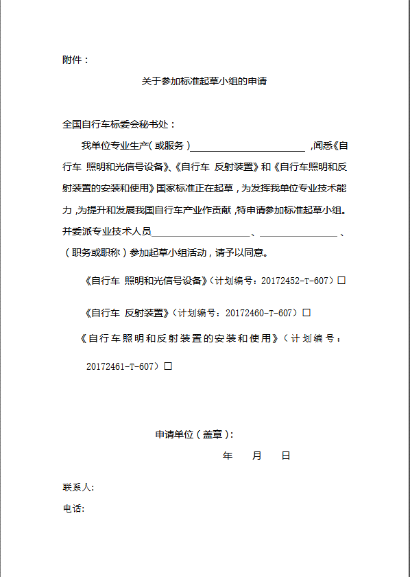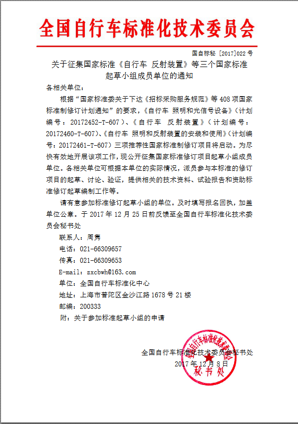 关于征集国家标准《自行车 反射装置》等三个国家标准 起草小组成员单位的通知
