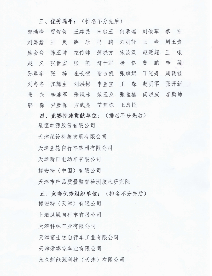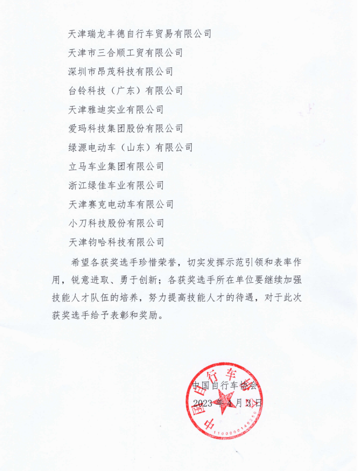 2022年全国行业职业技能竞赛——“星恒杯”第四届全国自行车与电动自行车装配职业技能竞赛获奖名单公告