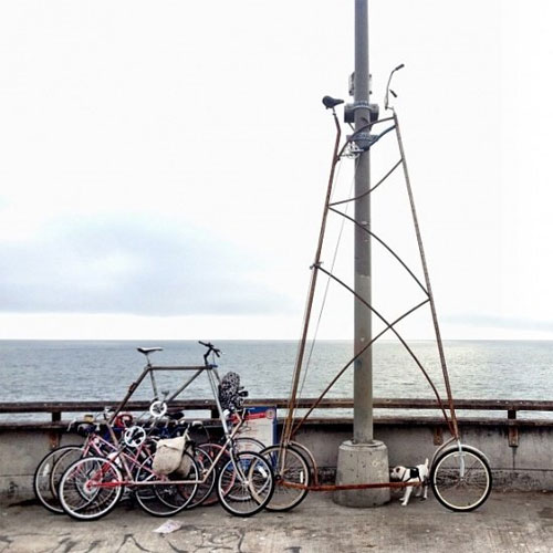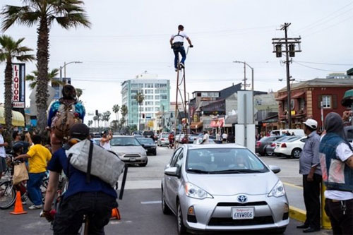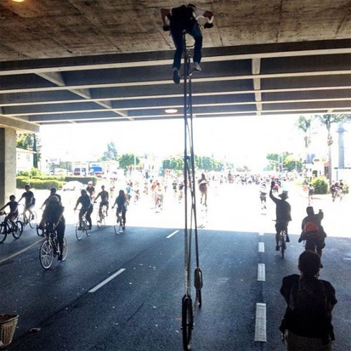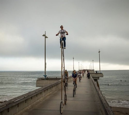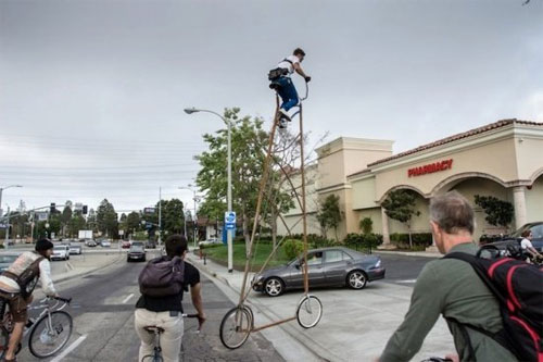 不久前在洛杉矶的大道上就有一辆约有两层楼高的自行车引来不少人的围观。美国人Richie Trimble不仅是一位电影特效师,更是一位骑行爱好者,他自己动手制作了一辆高达14.5英尺(约为4.42米)的巨型自行车。这么一辆超级自行车在浩浩荡荡的骑行队伍里想低调都很难。对付这么一辆自行车,Trimble上车要爬过那些交错的车架,而下车则要依靠路边电线杆的帮助才能顺利着陆。