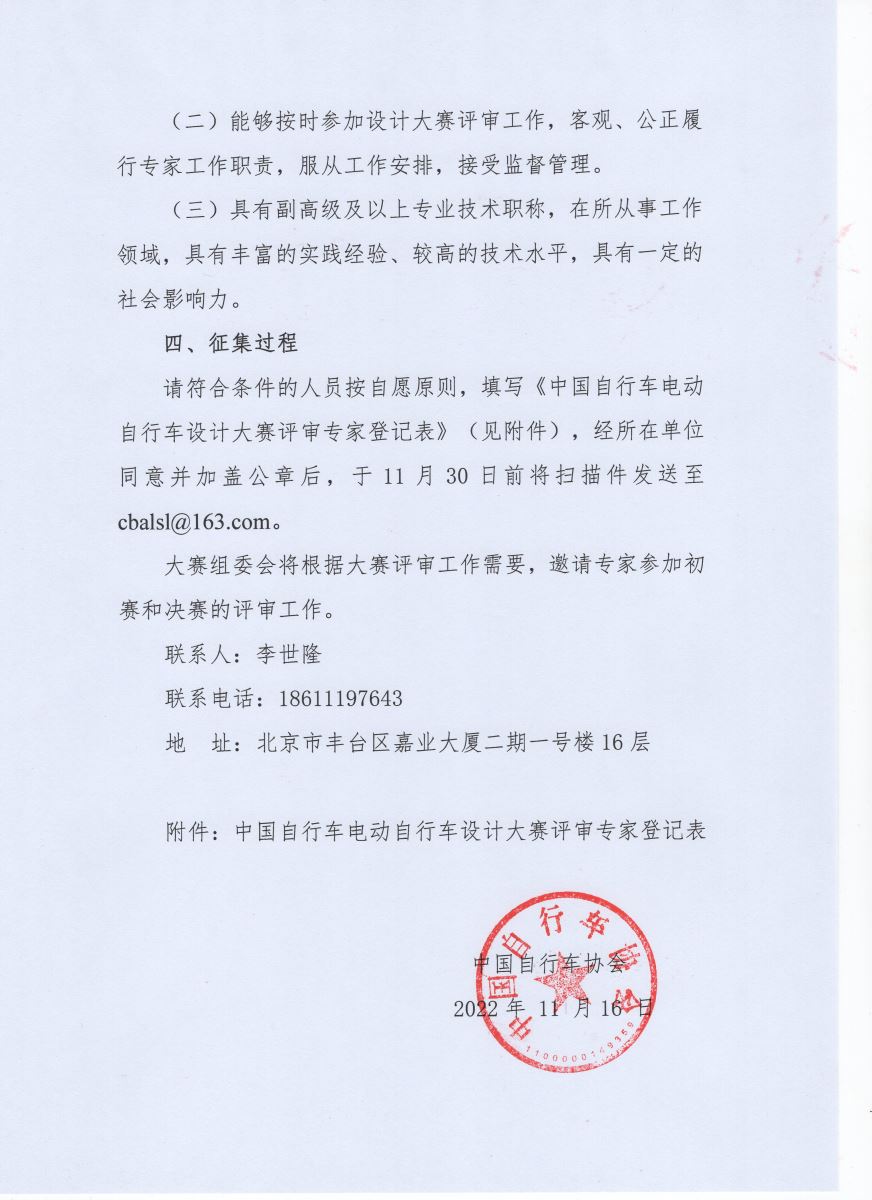 关于征集中国自行车电动自行车设计大赛评审专家的通知