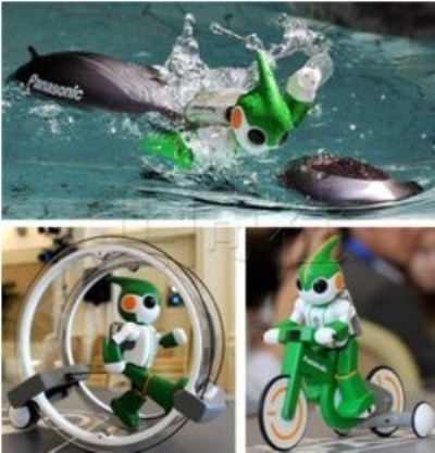 松下公司以镍氢电池“充电式EVOLTA”为动力机器人15日在东京率先展示了游泳(上)、骑自行车(右下)和跑马拉松的能力。报道称,该实验旨在展示电池性能。实验从2008年起开始实施,到今年已进行到第四次。机器人将于日本时间