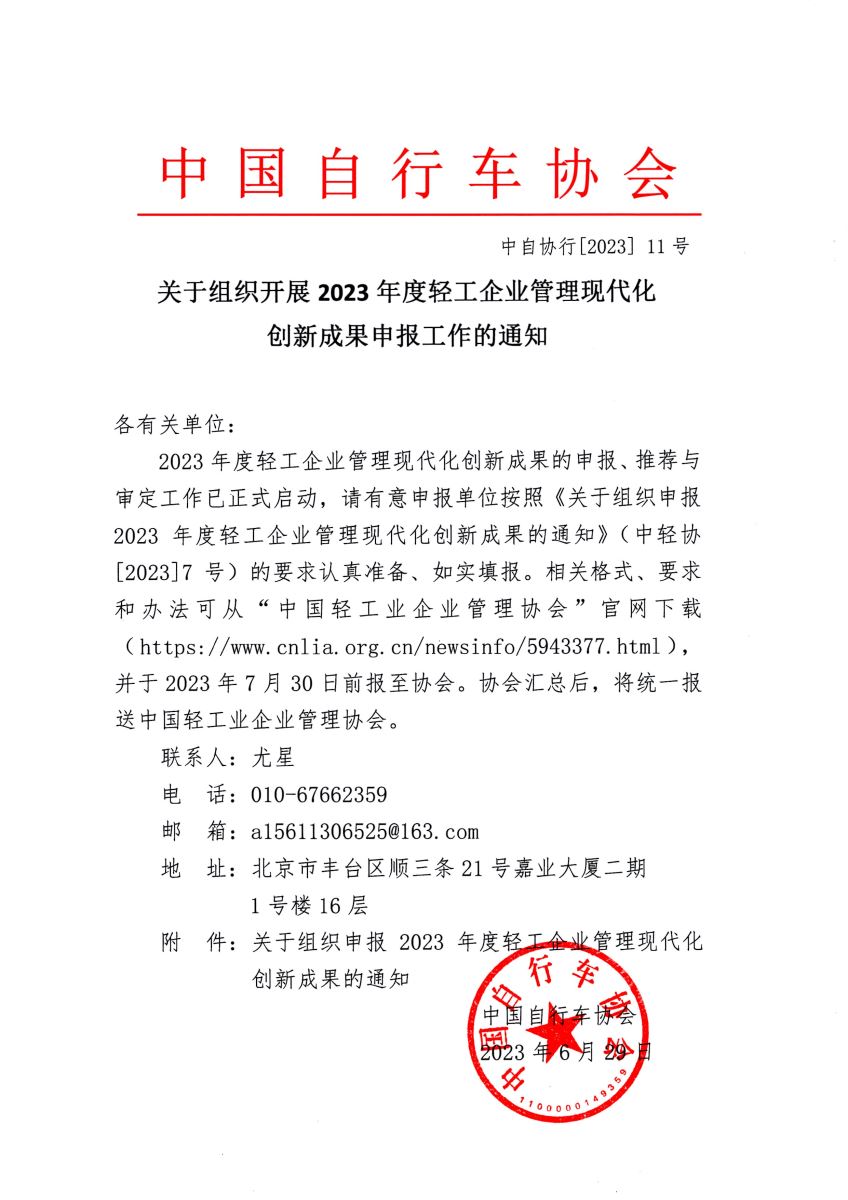 关于组织开展2023年度轻工企业管理现代化创新成果申报工作的通知 来源:中自协 作者:行业发展部 发布时间:2023-06-29 16:34 附件:关于组织申报2023年度轻工企业管理现代化创新成果的通知