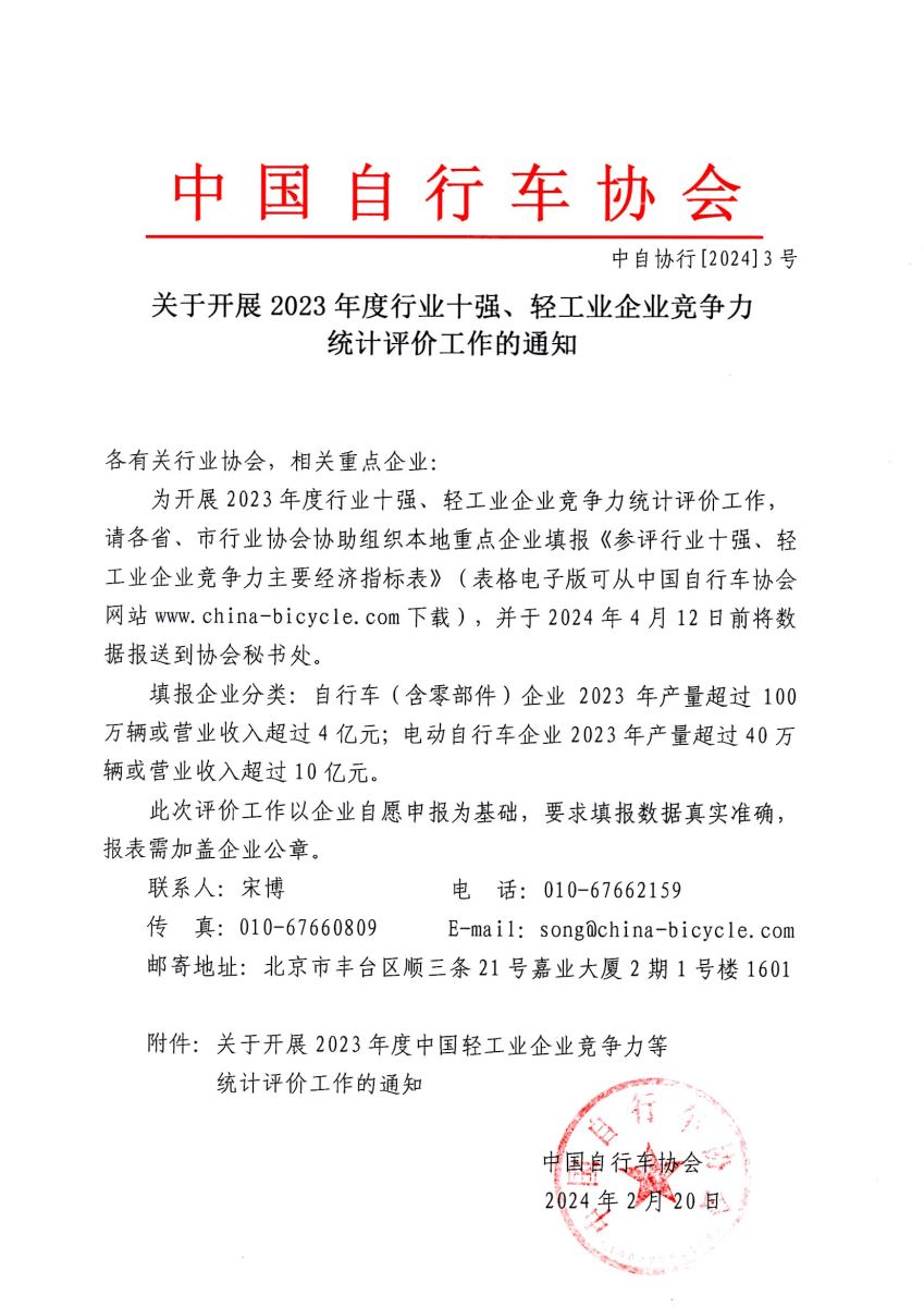 关于开展2023年度行业十强、轻工业企业竞争力统计评价工作的通知 来源:中自协 作者:行业发展部 发布时间:2024-02-20 09:35 附件: 1、关于开展2023年度中国轻工业企业竞争力等统计评价工作的通知 2、2023年度行业十强及百强企业报表