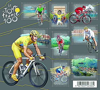法国邮政于6月29日发行“环法自行车赛百年”邮票小版张与珍藏小型张各1枚,内含邮票8枚,表现了穿着不同骑行衫的运动员,背景分别为法国著名的城市或旅游景点:卡尔维、巴黎、圣米歇尔山、阿讷西、巴涅尔—德比戈尔、凡尔赛宫、旺图山和拉普德兹。