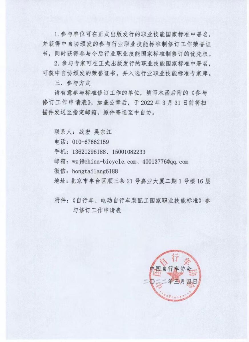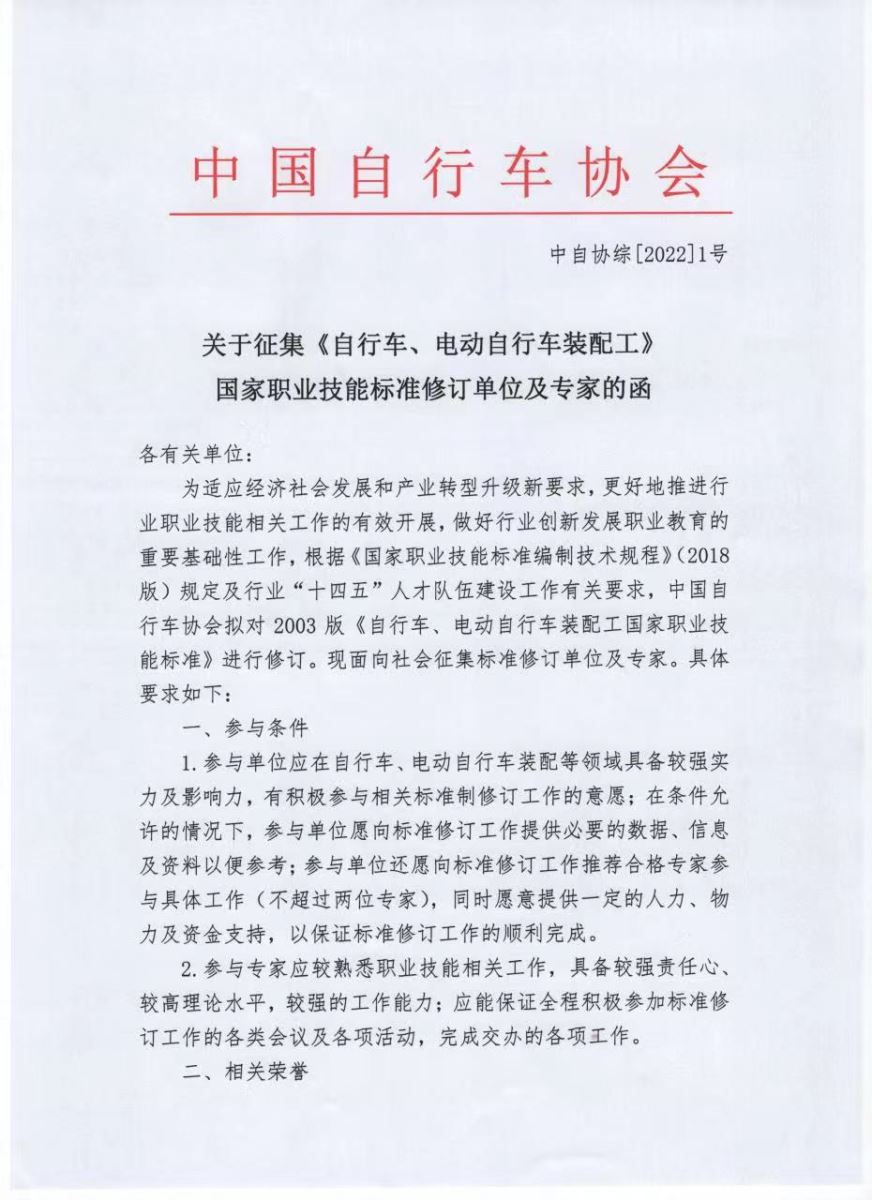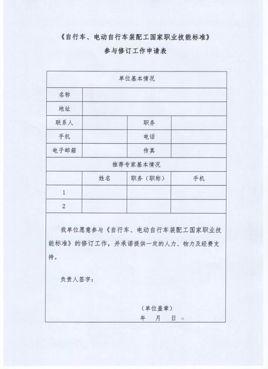 关于征集《自行车、电动自行车装配工》国家职业技能标准修订单位及专家的函