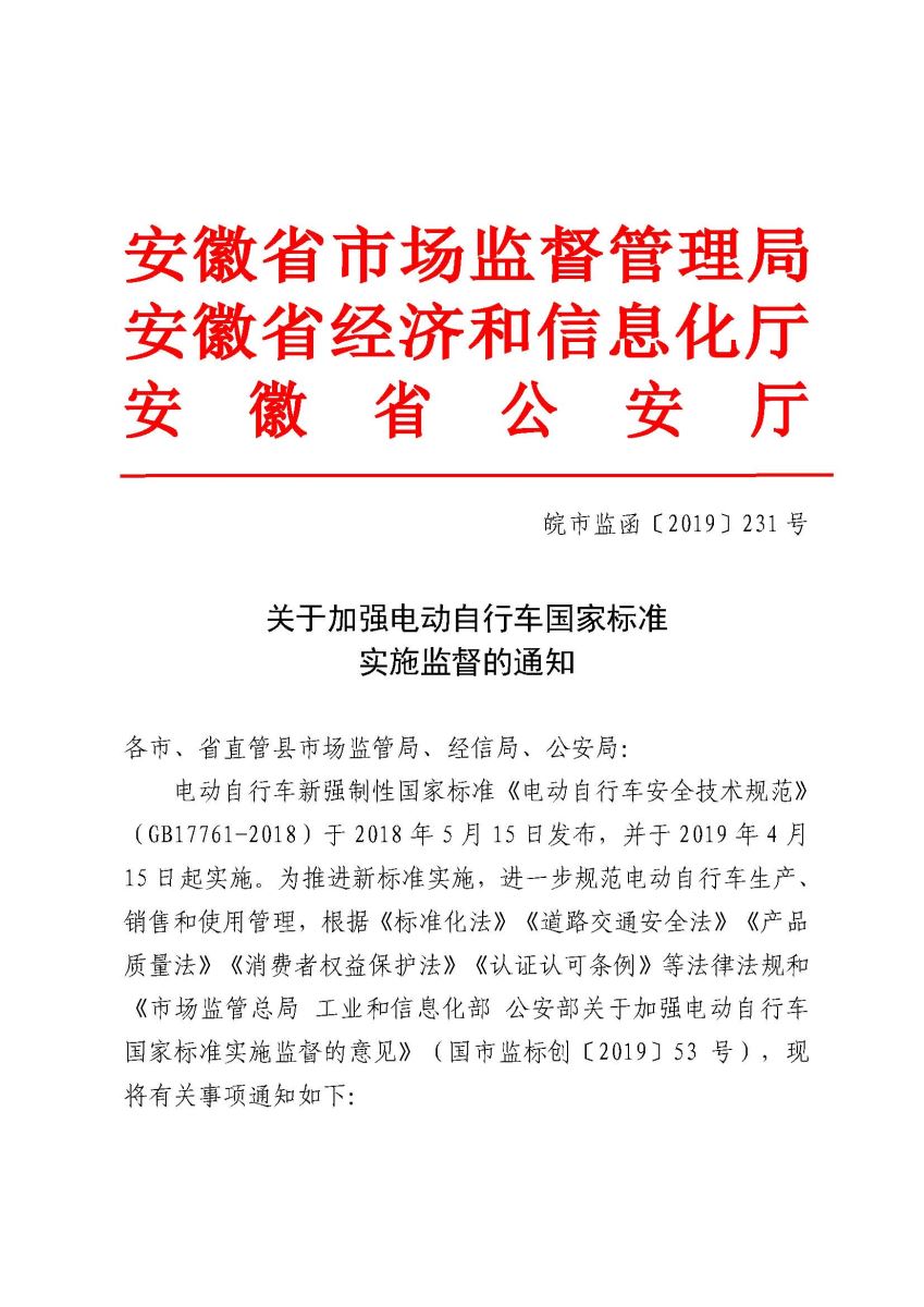 安徽省市场监管局、经济和信息化厅、公安厅关于加强电动自行车国家标准实施监督的通知 来源:安徽省市场监监督管理局 作者: 发布时间:2019-05-15 16:11 摘编:中自协; 摘编日期:2019-5-15