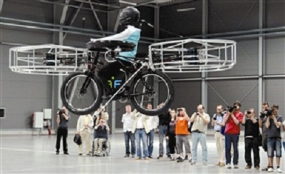 据报道,捷克某自行车厂商6月12日在布拉格向媒体公开了该公司联合另外两家自行车厂商,合作开发出的一款可以自由飞行的新型自行车。这辆飞行单车装有4个10KW的主电动机,两个3.5kw的稳定电动机,可持续飞行3-5分钟左右。在当天的试飞活动中,工作人员通过无线电遥控器操作“飞行自行车”顺利完成了从起飞到降落的一系列动作。