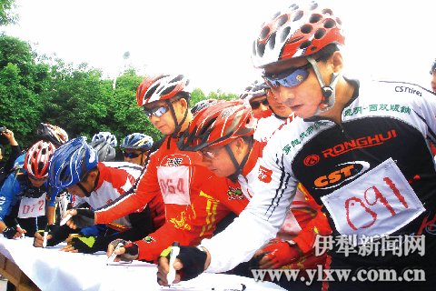 5月19日,参赛选手在裕民“山花杯”山地自行车越野拉力赛启动仪式上签名留念。