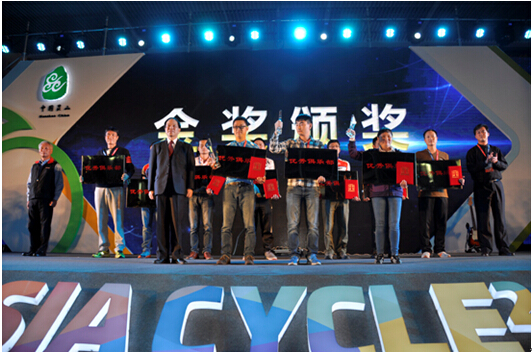 中国轻工业联合会王世成副会长为荣获优秀自行车骑游俱乐部金奖代表颁奖