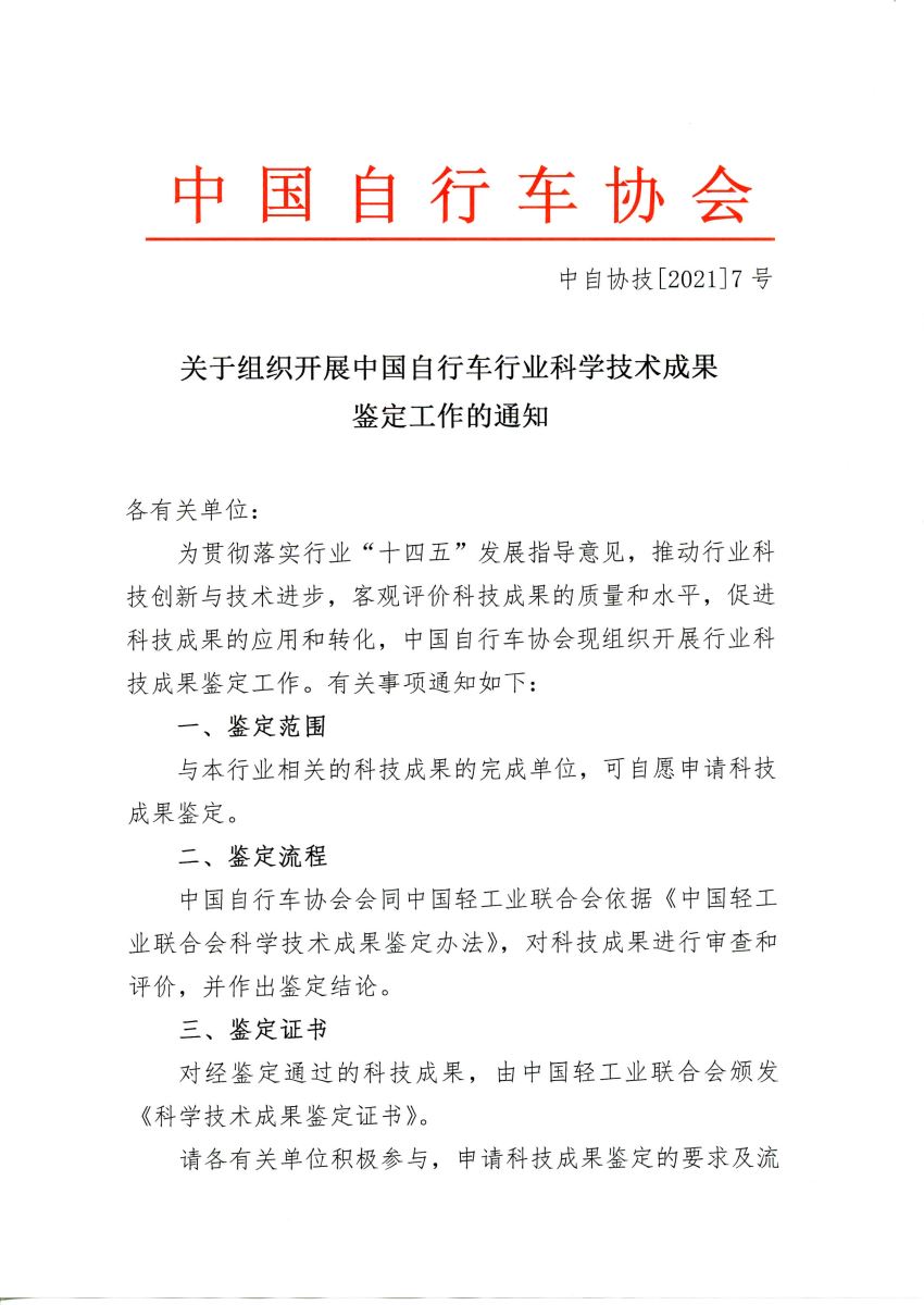 关于组织开展中国自行车行业科学技术成果鉴定工作的通知 来源:中自协 作者:技术标准部 发布时间:2021-04-29 10:19 附件:1.中国轻工业联合会科学技术成果鉴定办法 2.科技成果鉴定申请表格式及申请资料目录