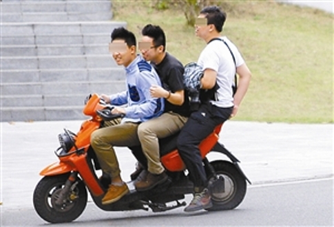 三位男子在校园内“拼车”飞奔(深大有万余辆车穿行)