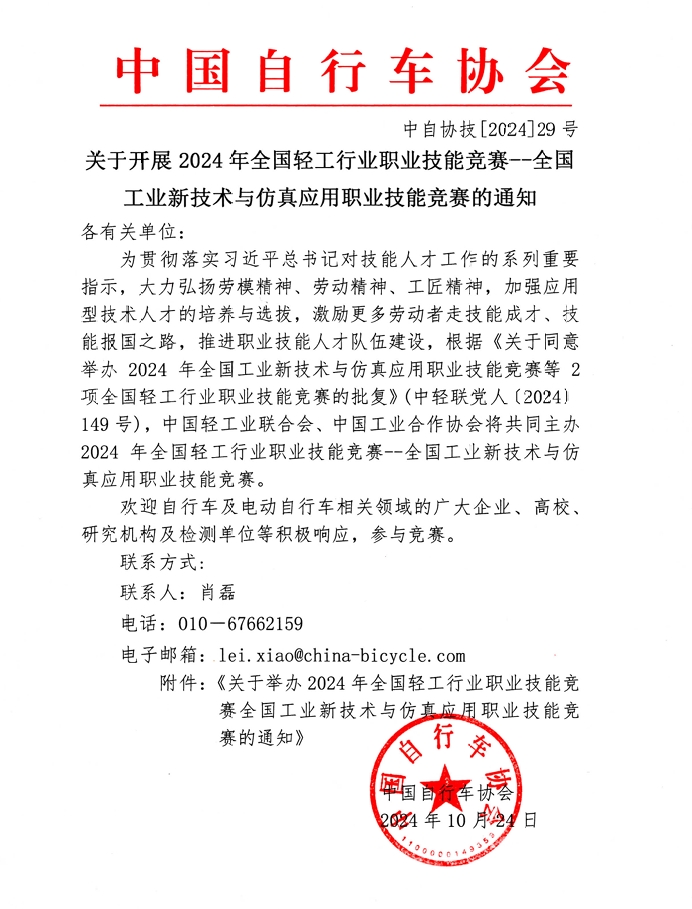 关于开展2024年全国轻工行业职业技能竞赛--全国工业新技术与仿真应用职业技能竞赛的通知 来源:中自协 作者: 发布时间:2024-10-25 10:08 附件:关于举办2024年全国轻工行业职业技能竞赛全国工业新技术与仿真应用职业技能竞赛的通知