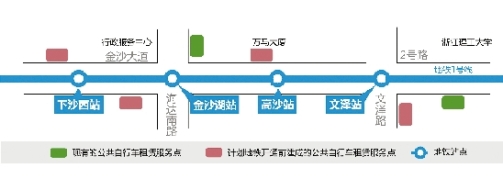 金沙湖站和文泽路站两个地铁站出口,预计人流量相对较大,之前都已有公共自行车点投入使用,加上新设的点,这样,两个地铁站出口附近将各有两个公共自行车点。同时提醒一下,为方便市民还车,下沙目前设了三个24小时还车点,分别位于下沙路与1号路口西北角B1公交站旁、5号大街4号大街西北面物美大卖场、1号大街4号大街东西面下沙商贸城。