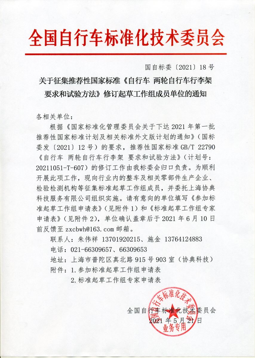 关于征集推荐性国家标准《自行车 两轮自行车行李架 要求和试验方法》修订起草工作组成员单位的通知 来源:中自协 作者:技术标准部 发布时间:2021-05-21 16:22 附件:1.参加标准起草工作组申请表 2.标准起草工作组专家申请表