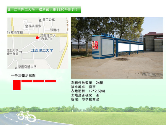 据悉,公共自行车标准站内将建设一个服务亭、三个停车棚,其中更设有可供市民充值洪城一卡通、缴纳水气费、手机话费充值等一系列便民服务的便民一体机。