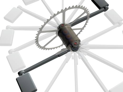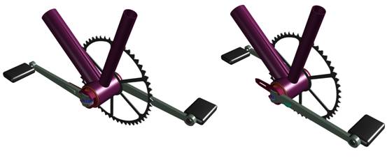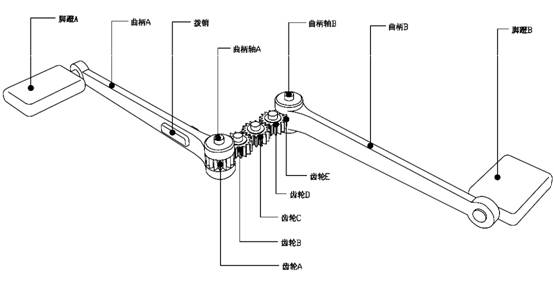 2转动脚蹬A曲柄A,使其绕曲柄轴A逆时针转动,从而带动齿轮A逆时针转动,同时带动齿轮B C D E 分别向顺时针 逆时针 顺时针 逆时针同速转动,由于曲转柄B与齿轮E固定连接,所以曲柄B和脚蹬B也同时同速逆时针绕曲柄轴B转动。