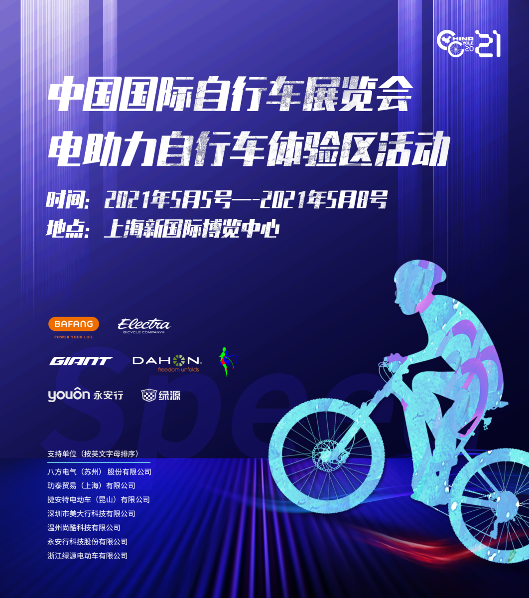 为了使电助力自行车更好的普及与发展,结合中国自行车行业及科技发展大势、推动健康环保绿色骑行的理念,由中国国际自行车展览会联合全国自行车工业信息中心共同主办的电助力自行车体验区活动,将于2021年5月5日至5月8日,在上海新国际博览中心举办。据了解,此次电助力自行车体验区共计占地2200平米,设有品牌区、报名区、签到区、装备区、医疗点、体验赛道。