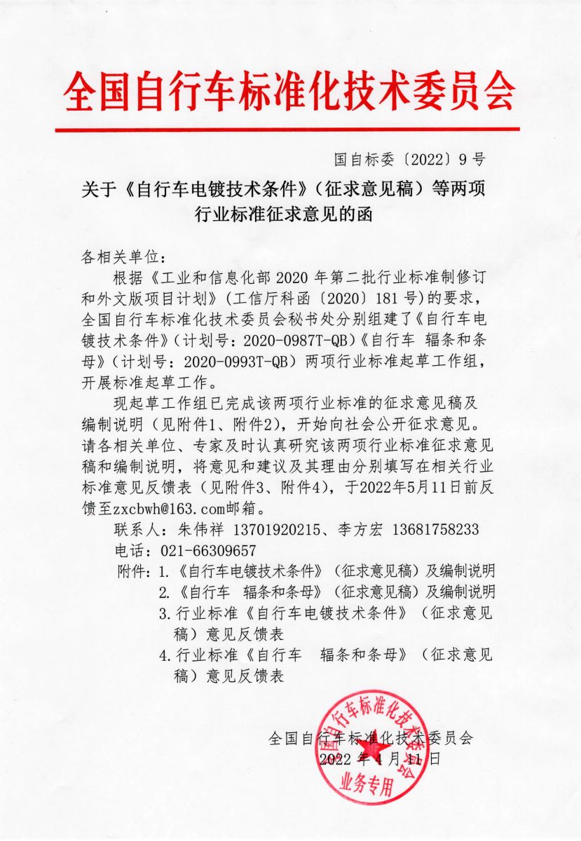 关于《自行车电镀技术条件》(征求意见稿)等两项行业标准征求意见的函 来源:中自协 作者:技术标准部 发布时间:2022-04-11 15:41 附件:1.《自行车电镀技术条件》(征求意见稿)及编制说明 2.《自行车 辐条和条母》(征求意见稿)及编制说明 3.行业标准《自行车电镀技术条件》(征求意见稿)意见反馈表 4.行业标准《自行车 辐条和条母》(征求意见稿)意见反馈表